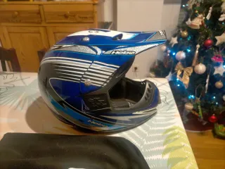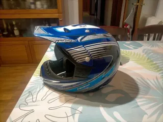 Casco de moto de la marca Hebo con un diseño deportivo en tonos azules y blancos. Para campo, muy poco uso, estado muy bueno Talla XS. Talla 53 - 54 Con bolsa de tela original Azul blanco Silver - Diseño aerodinámico. - Visera integrada. - Interior acolchado. - Con ventilación
