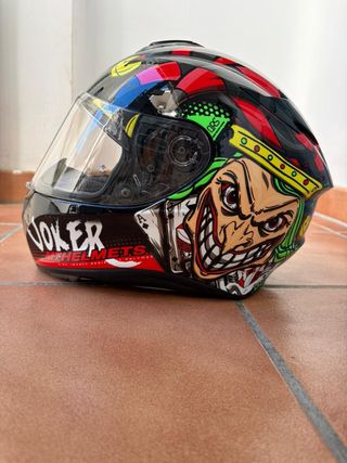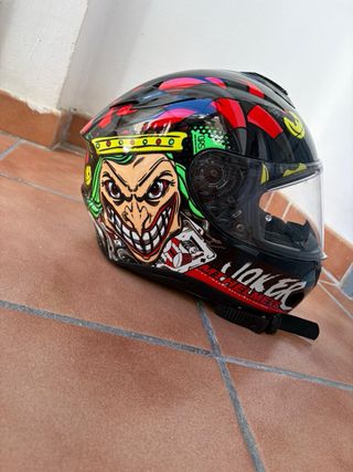 Casco de moto con diseño inspirado en el Joker. - Diseño llamativo y colorido. - Marca MT Helmets. - Talla M