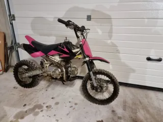 Pitbike de 125cc con un diseño en color rosa y negro Se vende por no usar, se le hizo motor nuevo y aun esta en rodaje, hay que revisarle los frenos y carburar, se entrega aparte otro bloque motor 140cc Neumatico trasero nuevo