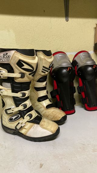 Conjunto de botas de enduro y protecciones para las piernas. - Botas de color beige y negro con cierres. - Protecciones de piernas negras con detalles rojos.