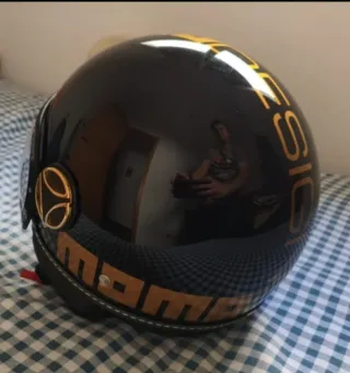 Casco jet Momo Design en color negro con detalles dorados. - Diseño elegante y deportivo. - Color negro con detalles dorados. - Logotipo de Momo Design. - Acabado brillante. - Visera transparente. - Talla XS
