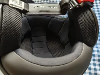 Casco de moto con un diseño moderno y llamativo. -Talla XL -Marca Proxium - Color base negro. - Líneas decorativas en rojo y blanco. - Visera transparente.