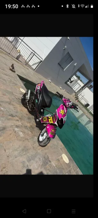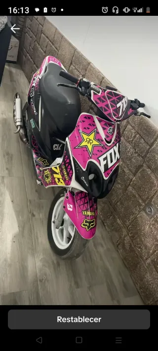 Scooter Yamaha Jog en color negro. - 70 airsal ( En rodaje ni 1 deposito) -Cigüeñal malosi -Rotor Italki selectra fijo -Trasmision stage 6 -Desarrollos primarios y -secundarios malosi -Bomba de agua stage6 alto caudal -Doble radiador -Barras de refuerzo -Marcador de temperatura koso -Instalación eléctrica con una batería de 12v para las luces -Manetas regulables -Pinza delantera rpm -Pinza trasera Brembo -Cubiertas semi slick -top rosa completo a falta de juntas ITV HASTA 2027