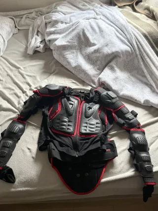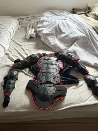 Traje de moto completo con protecciones integradas para mayor seguridad. - Diseño en color negro con detalles en rojo. - Protecciones rígidas en torso, hombros, codos y rodillas. - Tejido resistente y transpirable. -Traje alpinestar talla M