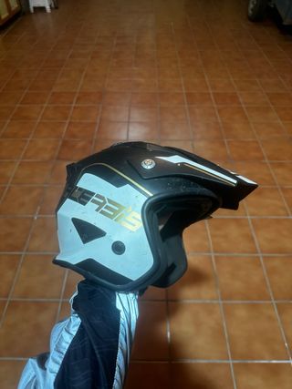Casco de moto con diseño deportivo y protector. - Color negro y blanco. - Detalles dorados. - Visera pronunciada.