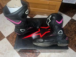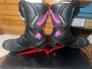 Botas de moto Alpinestars para mujer en color negro y rosa. Diseñadas para ofrecer protección y comodidad. - Talla 40, tengo un 39 pero recomiendan una talla más para mejor comodidad. - Cierre con cremallera y velcro. - Protecciones en tobillo y espinilla. - Suela de goma antideslizante. - Detalle de logo Alpinestars. - 3 usos Precio en tienda 200€