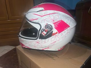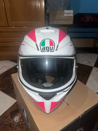 Casco de moto AGV con diseño en blanco y detalles en rosa. - Talla S/M - Diseño deportivo. - Visera clara y oscura. - Interior cómodo. - 1 puesta Precio en tienda 245€