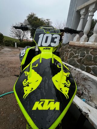 Moto de cross KTM 450 del año 2018. Diseño llamativo en color amarillo y negro con detalles de Red Bull. - Motor de 450cc.. - super cross -electro ventiladores puesto -arranque electrónico -horquillas y suspensión echas ace poco -cambio de aceite cada 10h -filtro de aceite y de aire nuevos revien cambiados -otro juego de cacha originales ❗️podria cambiar por algo que me interese escucho ofertas❗️