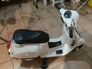 Moto Vespa eléctrica para niños, ideal para paseos divertidos. - Diseño clásico tipo scooter. - Color beige. - Asiento negro efecto acolchado. - Ruedas resistentes. -Bateria estropeada de no usarla. -Catgador incluido. PRECIO NO NEGOCIABLE.