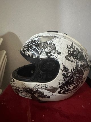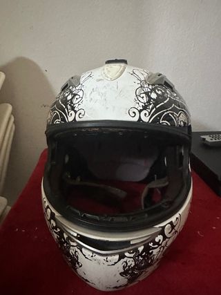 Casco de moto con un diseño llamativo en blanco y negro. - Diseño con detalles gráficos. - Exterior resistente.
