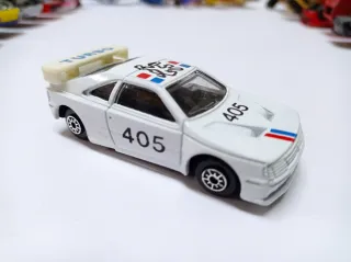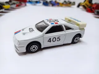Réplica en miniatura de un coche Peugeot 405 Turbo. - Color blanco. - Detalles de competición con franjas rojas y azules. - Inscripción 'TURBO' en el alerón trasero. - Número '405' visible en los laterales y capó. Marca Maisto. Principios del siglo XX Buen estado. Envío inmediato.