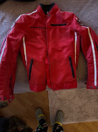 Chaqueta de moto V4 en perfecto estado, ideal para protegerte en tus rutas. - Diseño en color negro con detalles en rojo. - Cierre frontal con cremallera. - Puños ajustables.
