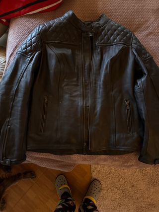 Chaqueta de cuero para mujer, ideal para motociclismo con protecciones tanto en espalda como en codos - Diseño acolchado en hombros. - Cierre frontal con cremallera. - Bolsillos frontales con cremallera. Cuero grueso,con solo una puesta