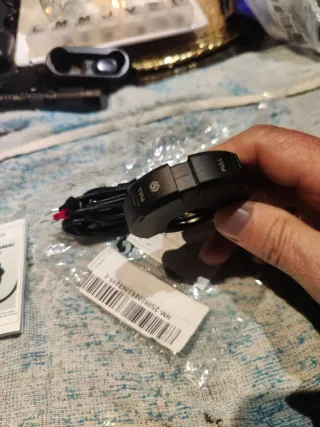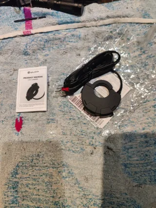 Cargador tipo C para móviles con adaptador para manillar de moto. Incluye manual de producto. - Diseño circular negro. - Cable de carga negro con conectores rojos.