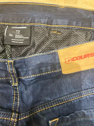 Pantalón vaquero de la marca COURSE, ideal para carretera. - Talla W36 L34. - Composición: 50% Algodón, 30% Poliéster, 20% Du Pont Kevlar. - Muy poco uso - Protecciones rodillas y caderas