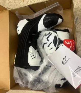 Botas de moto Alpinestars Supertech R en color negro y blanco. - Nuevas por estrenar con etiquetas. - Diseño deportivo y ventiladas. - Cierre de cremallera lateral. - Protecciones integradas. - Año 2025. - Talla 42