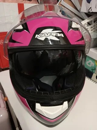 Casco de moto Kappa en color rosa, talla M. Solo ha tenido un uso. - Diseño deportivo. - Visera transparente. - Interior acolchado.