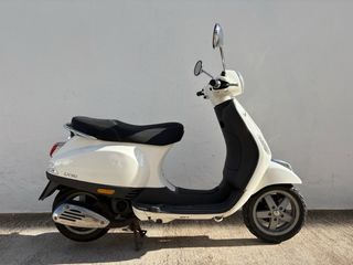 Scooter Vespa de 49cc en color blanco. Un vehículo ágil y práctico para la ciudad. - Diseño clásico Vespa. - Asiento negro. - Ruedas de aleación.