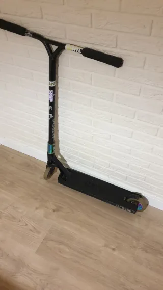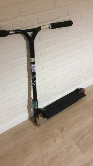 Patinete de estilo libre en color negro, diseñado para trucos y acrobacias. - Manillar resistente. - Ruedas duraderas. - Plataforma antideslizante.