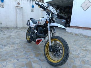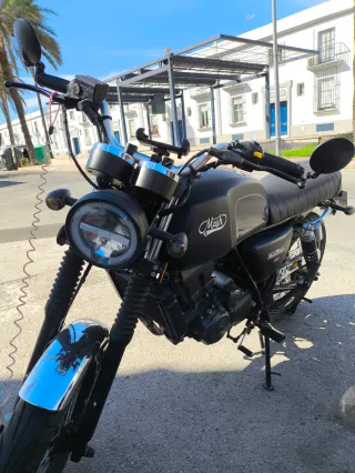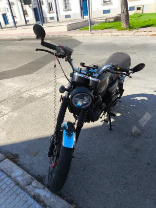 Moto estilo scrambler de color negro. - Asiento marrón. - Ruedas todoterreno. - Escape cromado. Itv pasada y filtros y cambio aceite recientes.