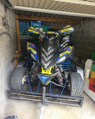Quad Yamaha Raptor 660 2005 Trapecios Laegers +3" Eje trasero reforzado +3" Buje trasero nuevo Raquetas xwr Latiguillos delanteros Todos lo protectores de bajos (trapecios,chasis y disco y plato trasero) Focos y marcador led Llantas y neumáticos para asfalto y tierra ITV hasta junio 2027 + info privado
