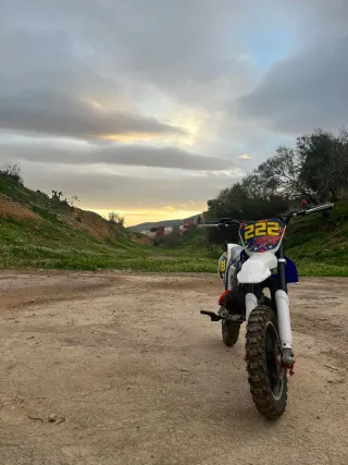 Mini moto de cross con muy poco uso. Ideal para iniciarse en el mundo del motocross. - Diseño deportivo en azul y blanco. - Número 222 en la parte frontal y trasera. Precio poco negociable La moto a sido muy poco usada va como la seda