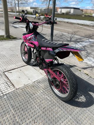 Moto muy cuidada y con muchas horas de trabajo detras de ella hace un mes que la pinte el chasis y aprobeche a sanear cableado y dejarla todo nuevo lleva: Metrakit Pro Race 4 80cc recien acabado el rodaje Cigueñal tpr carrera original con jaula de agujas italkit de plata Rodamientos cigueñal c4 Todos los rodamiento y jaulas de agujas reforzados Tambor caja de cambios TPR embragues NewFren Rotor mvt Premium Caja laminas malosi de carbono carburador 24 tipo PWK Filtro de aire TPR Escape RDC 80 Muchos accesorios de estetica mas manillar, cubre cadena most, cadena rosa etc La moto vuela y no da ni un problema, todo lo de motor que lleva demostrable con facturas. NO MAREANTES ESCUCHO OFERTAS no me urge venderla solo si me hacen una buena oferta, Tambien puedo hacer cambio a moto de mayor cilindrada de enduro o similar La doy con todas las piezas de serie para itv escape y todo y ruedas de 21 y 18