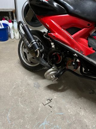 Scooter Yamaha aerox tapas en rojo y negro, la moto va perfecta lleva un metrakit pro race 70 24 polini embrague stage 6 transmisión malossi variador malossi cigueñal malossi, escape matias racing, rotor mvt naranja y muchas cosas más,hecha desde 0 a capricho - Todo comprado nuevo