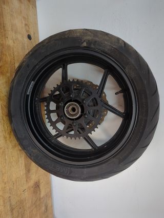 Vendo llanta trasera completa para Kawasaki Z750. Está en buen estado, con neumático Metzeler montado,precio incluye disco de freno,plato y casquillos.Solo llanta y goma 100€