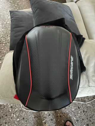 Mochila para casco de moto, nueva a estrenar. Ideal para transportar tu casco de forma segura y cómoda. - Diseño deportivo. - Acabado en carbono. - Detalles en rojo.