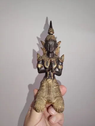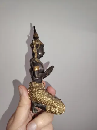 Figura decorativa de estilo tailandés, con detalles dorados. - Material: Bronce. - Diseño: Figura arrodillada con las manos juntas en señal de oración. - Acabado: Detalles en dorado sobre base oscura.