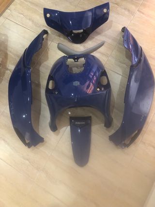 Juego de carenado para Piaggio Fly 125 en color azul. Las piezas están en buen estado, con algunos pequeños signos de uso. - Incluye todas las piezas menos la que pertenece al faro. - Color azul oscuro brillante. - Perfecto para restaurar tu scooter. se vende por separado,también.