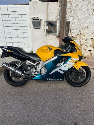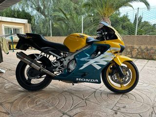 Moto deportiva Honda CBR 600 F4 en color amarillo y azul. - Diseño deportivo. - Ruedas de aleación. Escape dominator