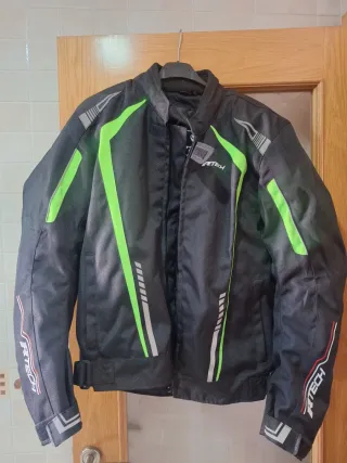 Chaqueta de motorista R-Tech, nueva a estrenar. - Diseño moderno con detalles en verde y gris. - Cierre frontal con cremallera. - Cinturón ajustable en la cintura. - Logos de la marca R-Tech en mangas y frontal.
