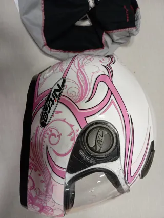 Casco de moto Nitro Racing para jóvenes, con un diseño blanco y detalles en rosa. - Diseño con motivos florales en rosa. - Visera transparente. - Marca: Nitro Racing.