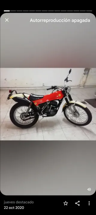 Se vende Montesa Cota 123T del año 1979, soy el segundo propietario. La moto se ha restaurado completamente, desmontándola hasta dejar el chasis pelado y rehaciéndola casi todas las piezas son nuevas. 🔧 Restauración completa: • Motor rehecho entero • Pistón nuevo • Cilindro rectificado • Carburador nuevo • Kit de arrastre nuevo • Cubiertas nuevas • Radios nuevos • Manillar nuevo • Suspensión delantera restaurada • Moto pintada completamente No tengo prisa en venderla. Acepto cambio por mini clasico Moto con documentación. Montesa, Bultaco, Ossa, moto clásica, trial clásico, Cota 123, Cota 247, Cota 348, Sherpa, Cappra.