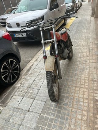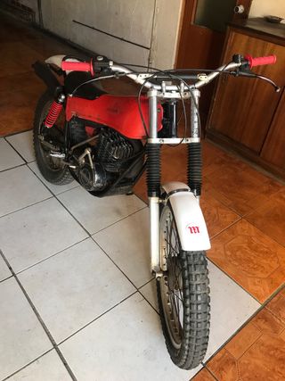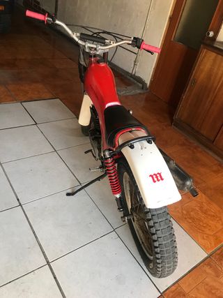 Moto de trial Montesa Cota 74 con un diseño clásico en rojo y blanco. FUNCIONA PERFECTAMENTE. - Moto de trial. - Color rojo y blanco. - Dada de baja (posibilidad de matricularse como historica) - Ruedas nuevas - Dos escapes (original + tubarro) - Codo escape de recambio - Magneto de recambio - Dos depositos (con asiento monoplaza o con asiento blipaza) - Guardabarros trasero de recambio - Puños Renthal trial nuevos - Cojinetes en buen estado