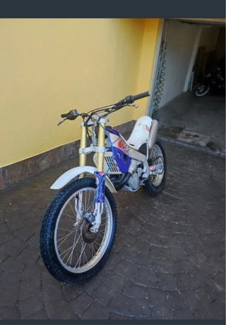 La moto va muy bien apesar de sus años pastillas nuevas carbulador nuevo Con asiento original ruedas al 90 Cilindrada 262 cc 2t - Color azul y blanco.