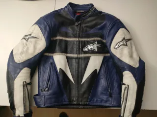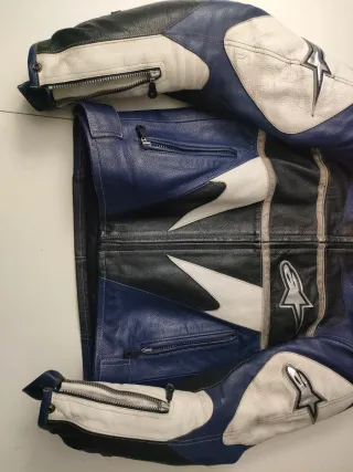 Chaqueta de piel , con protección en codos y hombros de serie ,talla S/M, tiene detalles de uso, lógicamente,pero ni una sola rascada. Para estatura entre 160-170, se puede ver sin ningún compromiso, el pantalón de piel, también entra en el precio. - Combinación de colores azul, blanco y negro. - Detalles de estrellas Alpinestars en las mangas. - Cremalleras en los puños y bolsillos frontales.