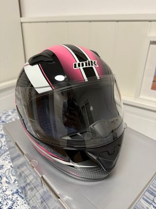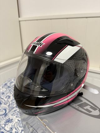 Casco de moto con un diseño moderno y llamativo. - Modelo ECER22-05 Combinación de colores negro y rosa. - Visera transparente. - Detalles en blanco y con patrón de hexágono. - Talla 49-50 cm
