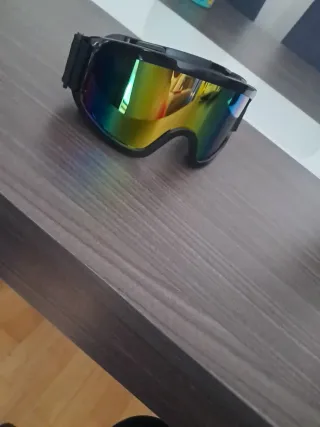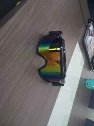 Gafas de moto con un diseño llamativo y lentes espejadas. - Montura negra. - Lentes con efecto multicolor.