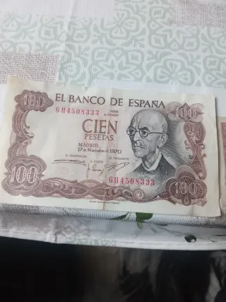 Billete de 100 pesetas del Banco de España, emitido en Madrid en 1970. Presenta el retrato de Manuel de Falla. - Serie 6H4508333. - Fecha de emisión: 17 de noviembre de 1970. - Diseño con motivos ornamentales.