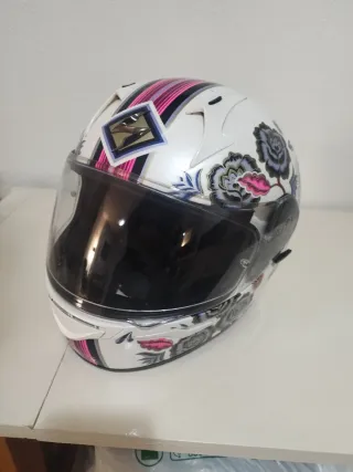 Casco de moto con un diseño único y llamativo. - Motivos de la luna y flores. - Combinación de colores blanco y rosa. - Casco muy cómodo - Talla S - En perfecto estado usado muy poco. Lo vendo porque se me ha roto la moto y no lo voy a poder usar más.