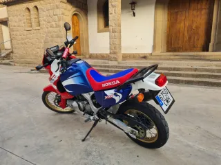 Se vende Honda África Twin 750 del año 1999 con 113.000 Km. ITV hasta junio de 2027. Mantenimiento al día. Amortiguador trasero TECHNOFLEX con pomo de precarga y con regulación en extensión y compresión. Neumáticos, discos delanteros, pastillas de frenos, kit de cadena más plato y piñón con unos 1000 Km. Engrasador de cadena Scottoiler. Escape Laser homologado (al ser más estrecho que el original los soportes de maletas están adaptados para que tengan la misma distancia al centro de la moto) Se entrega con las defensas, portamaletas Givi y soporte para baúl. No se entrega ni el gps ni la instalación. Sí que se deja el soporte por