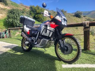 Moto Honda Africa twin 750 rd04 año 1991. 83mil km. Recién cambiado: bujias,aceites filtros, aceite y aire, regulador de corriente de calidad, retapizado asiento y recrecido, alzas manillar y calapies regulables perfecto altura piloto 185cm. Soporte de maletas y 3 maletas kappa. Escape arrow homologado paris dakar. Bateria nueva, Itv al día y en regla todo. Muy bien cuidada.