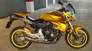 Moto Honda CB 600 F Hornet en color dorado. Un modelo naked con transmisión manual. La mas alta de gama del 2007, con solo 51000 km. Cargada de muchos extras, manetas, puños, cúpula, etc. Aceite y filtro K&N y otro normal de regal recién cambiado, y todos los mantenimientos escrupulosamente hechos en tiempo, neumáticos en perfecto estado. ITV y documentación en vigor y a mí nombre. - Con ABS. - 102 cv. - Intermitentes warning. - Semi carenados laterales a juego con carrocería. - Colin tapa asiento a juego con carrocería. - Diseño deportivo y llamativo. - Asiento negro. - Guardabarros trasero a juego con la carrocería. Lista