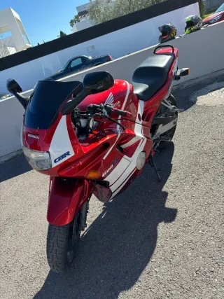 Moto deportiva Honda CBR 600 F del año 1995. Presenta un diseño icónico con los colores blanco, azul y rojo. - Modelo CBR 600 F. - Año de fabricación 1995. - Diseño deportivo tricolor. - Se entrega con escape de la foto homologado y el original - Tambien se entregan los intermitentes y portamatriculas original - Sillin nuevo tapizado - Neumaticos nuevos - Cambio de aceite , filtro aceite y filtro del aire nuevos. - Tensor cadena disteibucion recien puesta.