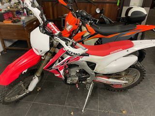 Moto Honda CRE F250R, 2014, 4T. en excelentes condiciones. Color rojo y blanco. Impecable estado estético. Muy buen estado. Usada 10 horas/año los últimos 4 años, prácticamente nada. (No registra Kms ni horas, pero no ha handado mucho). Duerme garaje. Última ITV nov 22 (actualización a cargo comprador). Arranque pedal (no eléctrico), pocos kilómetros, mousse adelante y atrás, neumáticos nuevos, algunos repuestos. Todos los mantenimientos. Sin competición, sólo rutas blandas.