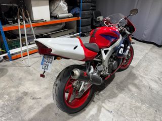 Honda CBR 954 RR Fireblade en color rojo y negro del año 2003 . Una moto deportiva muy cuidada,va muy fina en paso por curva y pesa muy poco. Soy el segundo propietariola moto utilizada fines de semana,para ir al trabajo,la vendo por poco uso y también quiero cambiar a una trail. Tiene 3 dientes menos. Líquidos cambiados,filtro potencia nuevo,fibra de escape cambiada. También daría el colector escape por arriba,porta matrículas y escape original,bomba de freno original. Neumáticos a medio uso,conti-race Attac 2,contisport-attack4. ITV diciembre 2026,también tengo las tres llavesoriginles Yamaha yzf r1,Kawasaki zx10rr,zx6,600r