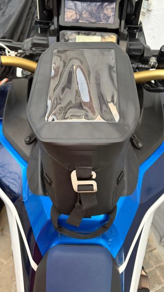 Bolsa sobredepósito SHAD para Honda Africa Twin. Accesorio original Honda. 4,5 litros de capacidad. Parte inferior con imanes protegidos y superior con agarre de correas. Queda perfectamente integrada y no entorpece en la dirección ni control de la moto. - Original Honda - Lista para instalar en Honda Africa Twin Adventure Sport 1100 - Tornillería incluida - Fácil montaje y desmontaje.